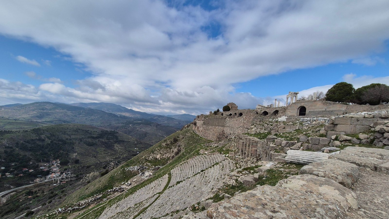 Bergama (Bergama, izmir) Helenistik dönemin yaklaşık M.Ö. 3. veya 2. binden beri en önemli krallığı Pergamon, Pergamon Akropolisi. Korunaklı yer olarak inşa edilmiş olan bu tepe üstünde kurulu şehir; terastan ovaya baktığınızda dini ve idari merkezleri, mühimmat depoları, kütüphanesi ile saraylarının yer aldığı bu korunaklı şehrin ne kadar ulaşılmaz olduğunu anlayabiliyoruz.